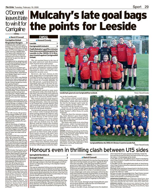 A super article in the Echo profiling our Under-13A girls team who were very unlucky to lose to a break-away goal against Leeside who are now leagues leaders
